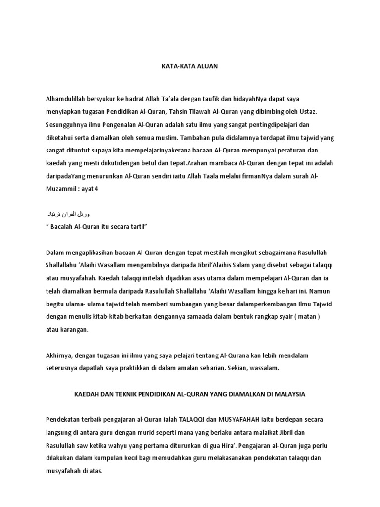 Tajwid merupakan ilmu membaca Al-Quran dengan baik dan betul. Dari segi amalan yang dibuat kesan kegemilangan Melakakhatam al-Quran majlis kesyukuran dan kenduri arwah mula dipraktikkanUsaha gigih. - Pastikan karangan itu berformat atau tidak - Gariskan tiga unsur penting.